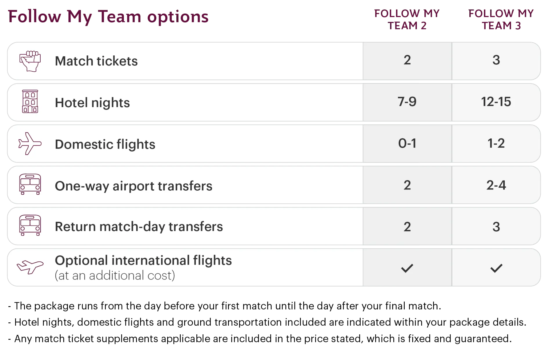 Every team will have a fixed, confirmed itinerary, ensuring a consistent and reliable experience across all Follow My Team packages.